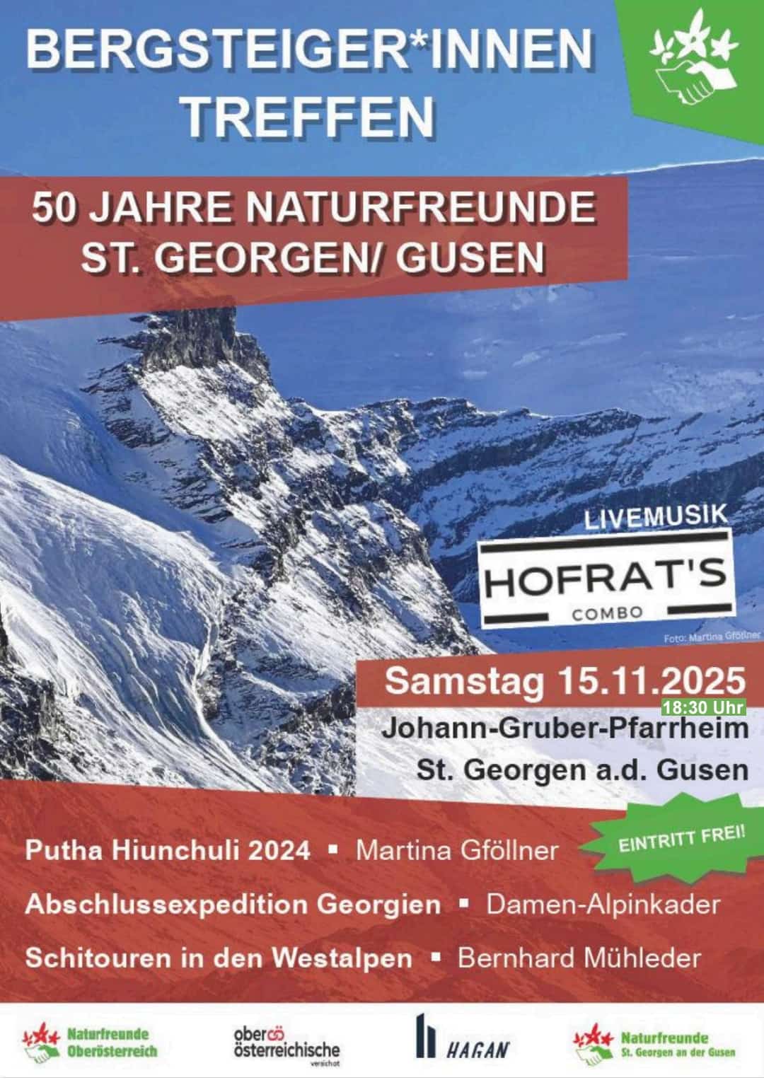 Anschließend feiern wir bei Musik der „Hofrat’s Combo“ das 50jährige Bestehen unserer Ortsgruppe. Das Team der Naturfreunde St. Georgen/Gusen freut sich auf euren Besuch.